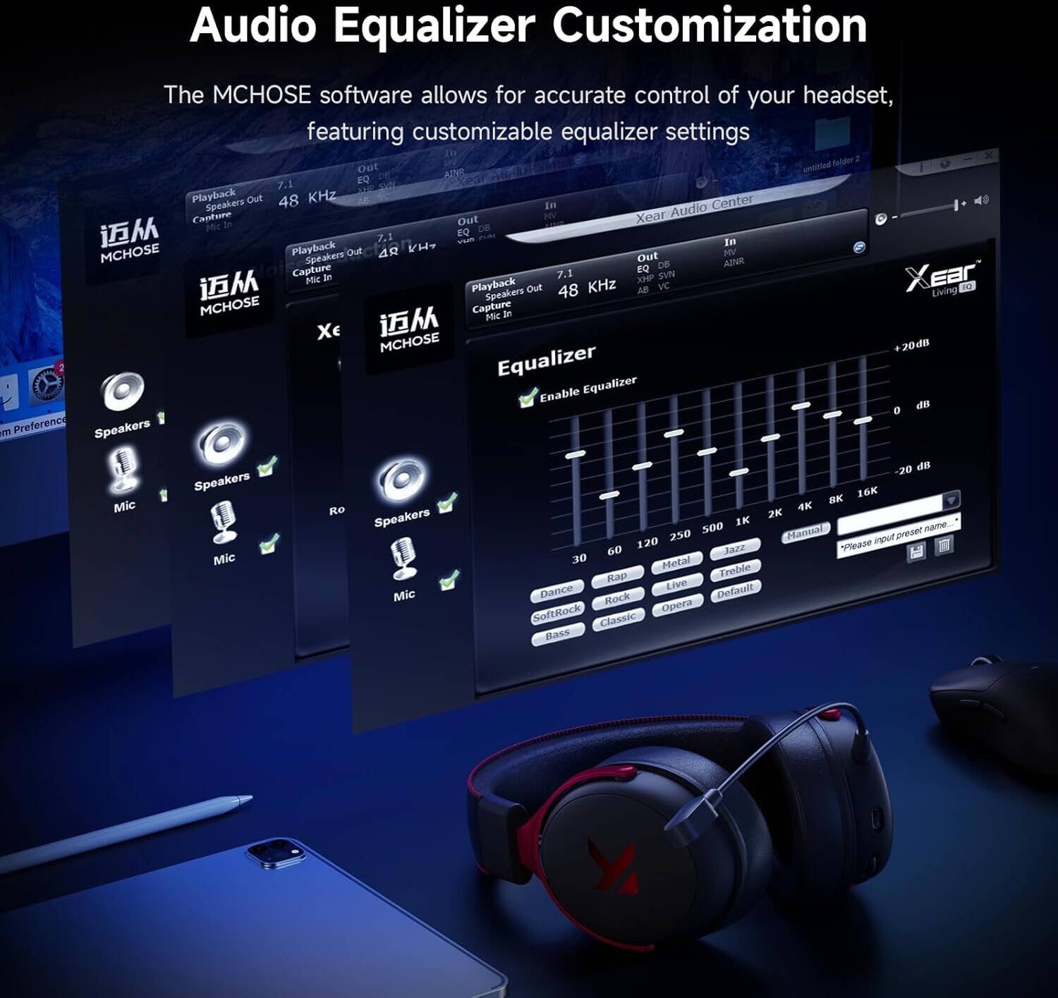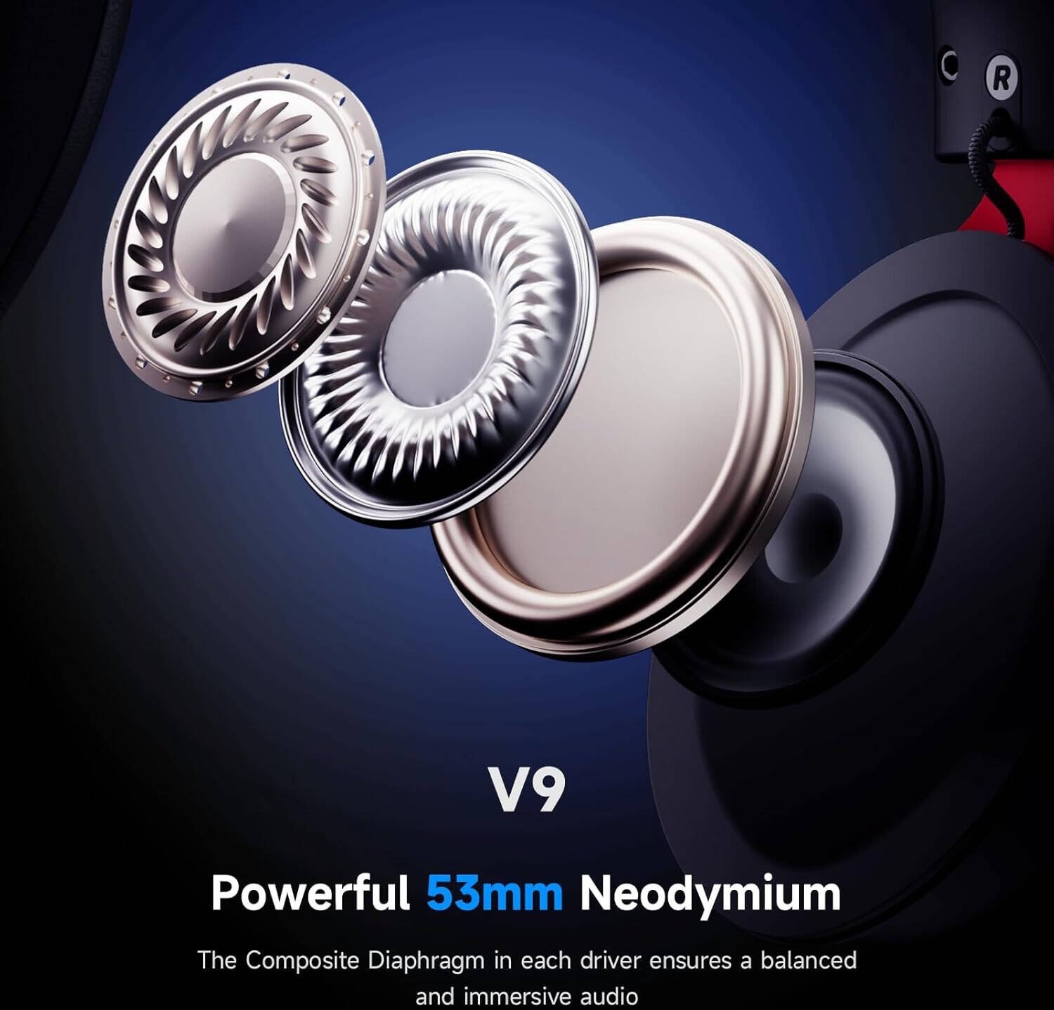 MCHOSE V9 Wireless Gaming Headset, 53mm Driver, TOPSPEED Wireless Technology, EQ Adjustment, Noise Reduction, 7.1 Surround Sound, Tri-Mode Connectivity, 1000mAh Battery, White & blue